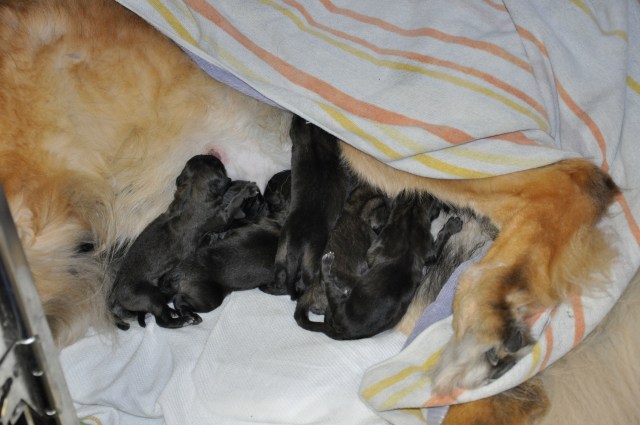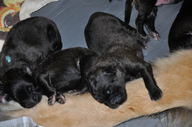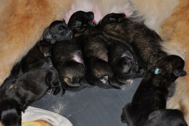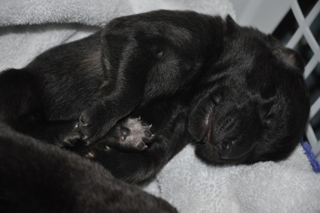 Puppy pictures are pretty generic when they are this age, but they still are great to look at. We have the pups nursing on Mom, curled up on piles, and just leaning against Mom’s leg and enjoying life!