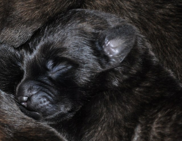 The little pups are a week old now. They squirm a lot and are enjoying life. One seems to be a potential jail breaker or escape artist. He may be trouble when he grows up!